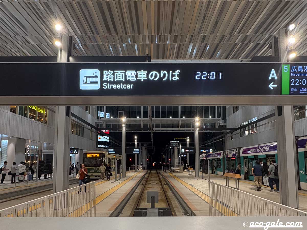 路面電車乗り場はAからDまで、広島港や宮島口に行く電車に乗ることができる。